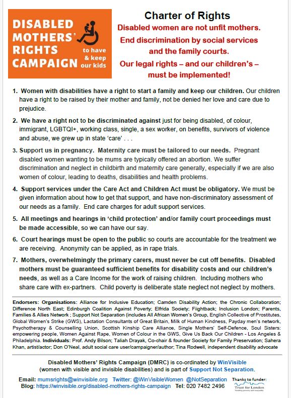 The Disabled Mothers' Rights Campaign, co-ordinated by WinVisible, brings disabled mothers together to: